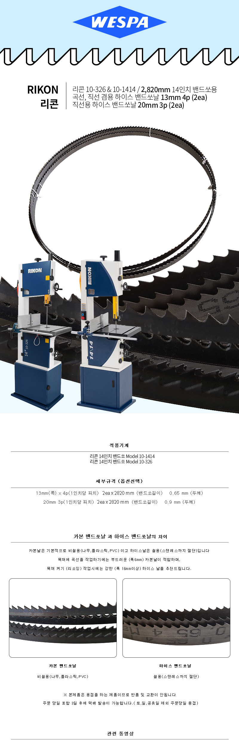WESPA14인치 하이스밴드쏘날 리콘 10-326 10-1414 /2820mm 곡선,직선 겸용 13mm 4p(2ea) 직선용 20mm 3p(2ea)