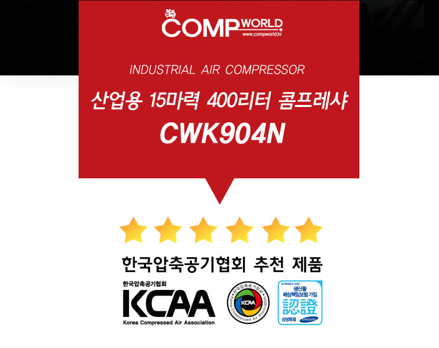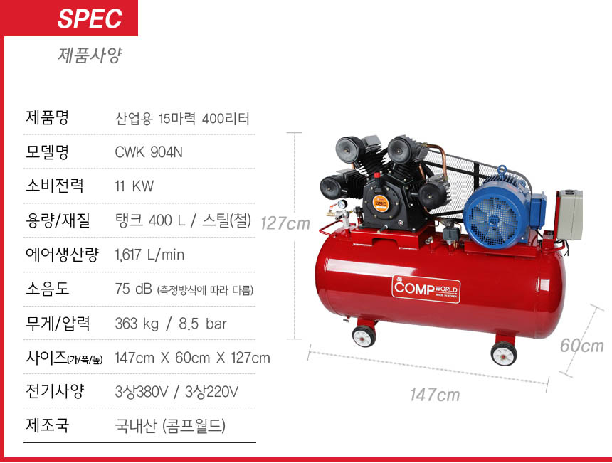 > 콤프월드 [CWK-904N] 산업용 콤프레샤 15마력 탱크용량 400리터