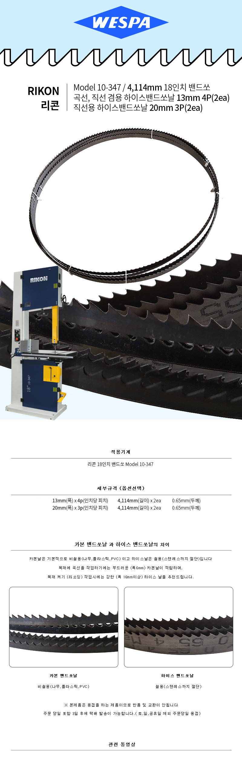 > WESPA 18인치 하이스밴드쏘날 리콘 10-347 4114mm 곡선,직선겸용 13mm 4p(2ea) 직선용 20mm 3p(2ea)