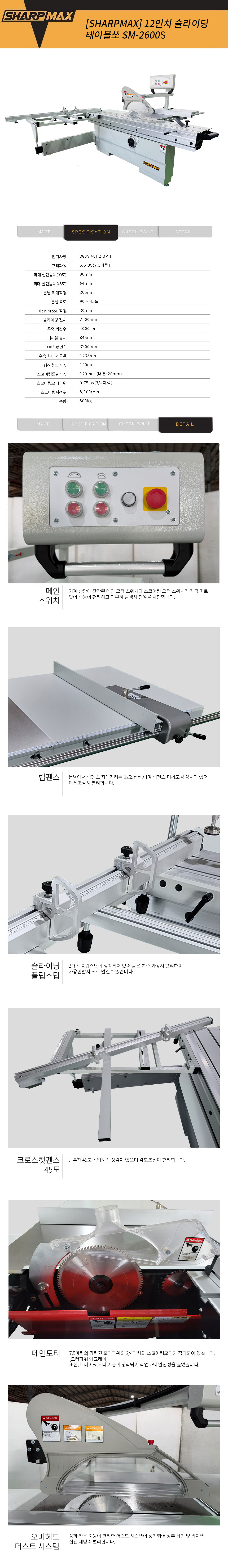샤프맥스 12인치 슬라이딩 테이블쏘 SM-2600S 슬라이딩길이 2600mm 삼상/7.5마력 모터브레이크장착